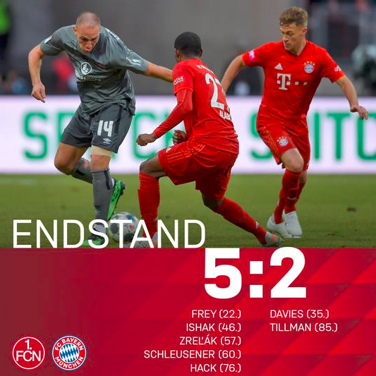 第66分钟,屈桑斯任意球攻门稍稍偏出。第72分钟,屈桑斯主罚的点球又被纽伦堡门将神勇扑出。第77分钟,纽伦堡禁区内接连攻门,乌尔赖希扑出榜首下,泽雷拉克禁区左边底线邻近横敲门前,哈卡推射空门得手,5-1,纽伦堡竟然领先拜仁4球了。第85分钟,迈尔右路传中,蒂尔曼门前头球冲顶破门,2-5,拜仁攻入挽回些许颜面的一球。最终,拜仁2-5不敌纽伦堡。