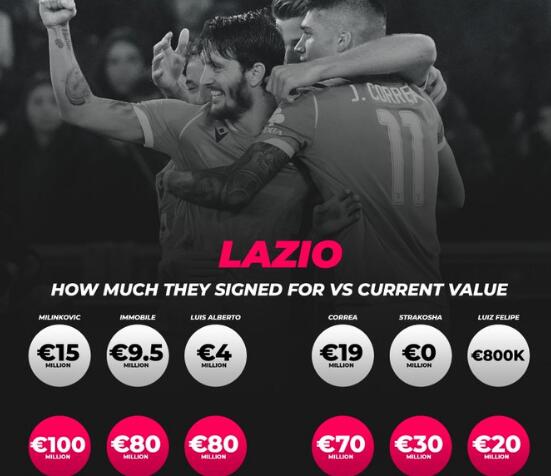 因莫比莱与科雷亚分别在2016年与2018年加盟拉齐奥,当时的转会费分别为950万欧元以及1900万欧元,而现在两人的身价为8000万欧元与7000万欧元。