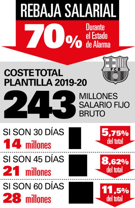 只计算基本薪酬的话,巴萨男足一队本赛季薪酬总额为2.43亿欧元。降薪一个月,男足少拿1400万欧元,巴萨薪酬开销将下降5.75%。假如巴萨降薪一个半月,男足少拿2100万欧元,巴萨薪酬开销将下降8.62%。假如巴萨降薪两个月的话,男足少拿2800万欧元,沙龙整体薪酬开销将下降11.5%。