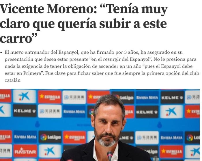 面临新赛季的冲甲使命,西班牙人现已宣告任命莫雷诺为球队新帅,莫雷诺也出席了自己就任后的首场发布会。 莫雷诺出任西班牙人主帅。