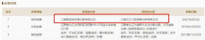 国家企业信用信息公示体系的数据显现,中甲沙龙江西联盛现已更名为“江西北大门足球沙龙”。