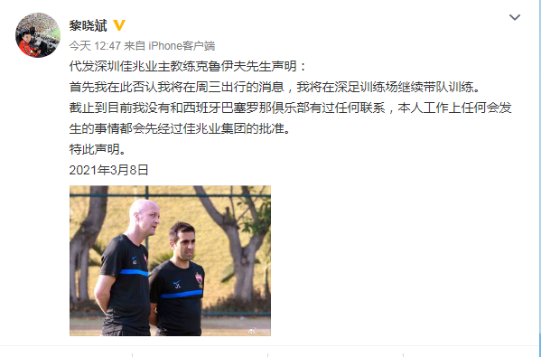 关于此前西班牙媒体有关小克鲁伊夫将回归巴塞罗那出任俱乐部技术总监一事,现任深圳队主帅小克鲁伊夫公开表态,自己将会继续留队执教。自己本周仍会出现在深圳队的训练场,而不是巴塞罗那。
