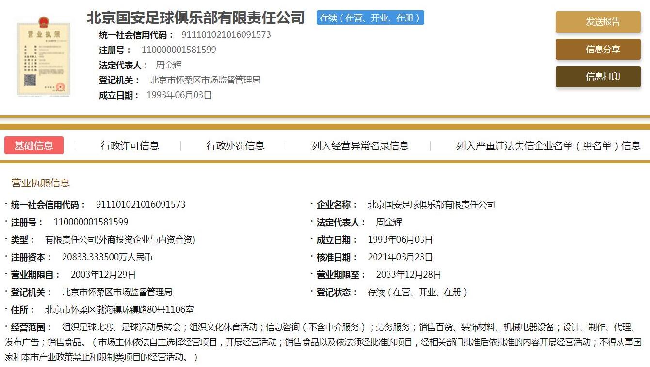 2021年3月25日消息,在国家企业信用信息公示系统中显示,北京中赫国安足球俱乐部已正式更名北京国安足球俱乐部。