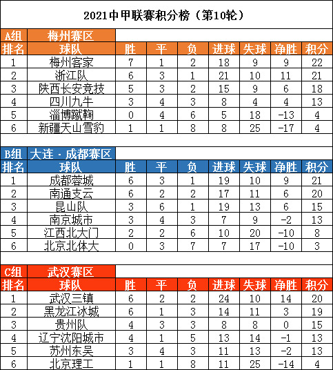 2021中甲联赛积分榜(第10轮)