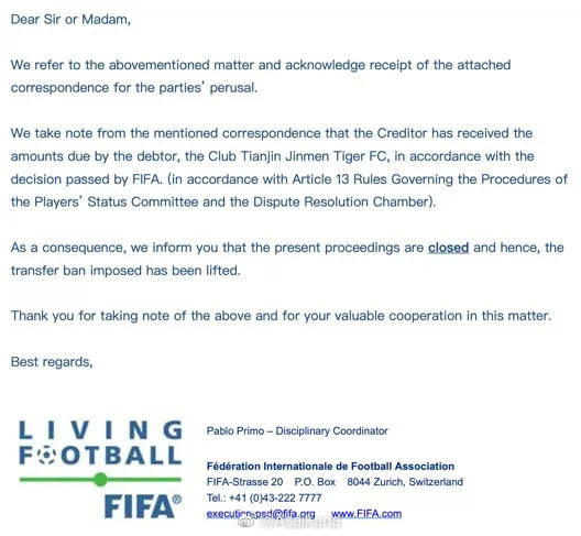由于天津津门虎俱乐部并未依照国际足联裁决的要求,在期限内完成向球员付款的义务,律师事务所根据相关规则,向国际足联申请对俱乐部的纪律处罚,分别由国际足联以及中国足协负责实施国际范围以及国内的注册转会禁令。