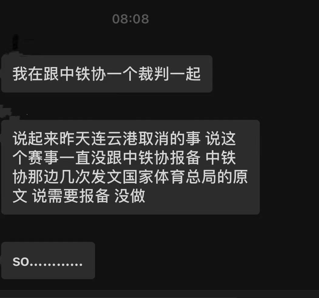 根据曝光的另一张群聊天纪录,在15日下午15时50分时,该名为李某的群主便发布了比赛取消的消息。