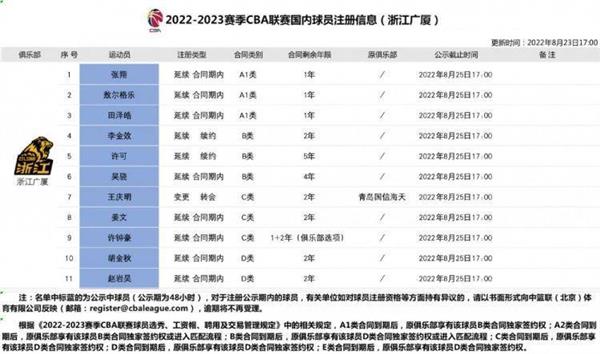 8月23日讯 今天,CBA官网公布了广厦男篮2022-23赛季的国内球员注册信息表,广厦目前已经完成了11人注册。