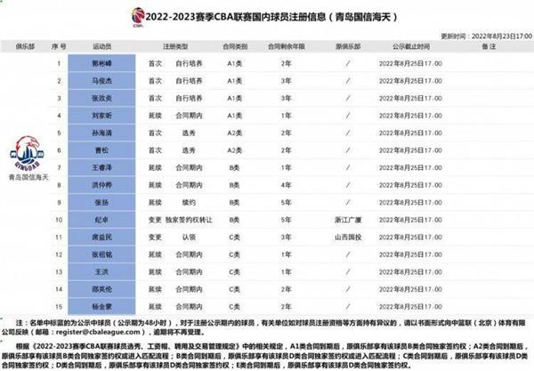 8月23日讯 今日,CBA官网公布了青岛男篮2022-23赛季的国内球员注册信息表,青岛队完成了15人注册。