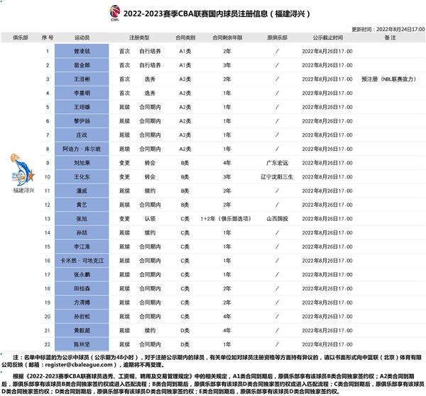 8月24日讯 CBA官网公布福建男篮国内球员注册信息表,首批注册了22人。