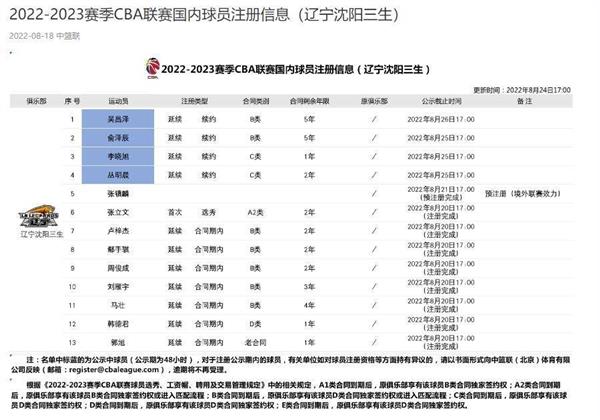 8月24日讯 CBA官网最新的国内球员注册信息显示,辽宁队与吴昌泽完成5年B类合同续约。