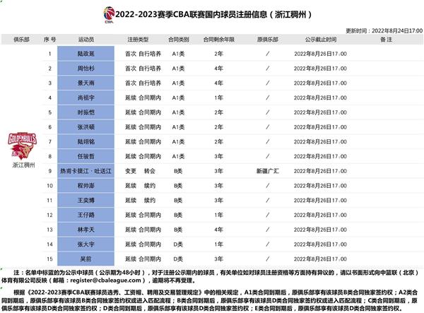 8月24日讯 CBA官网公布浙江男篮首批国内球员注册信息表,一共有15名球员。