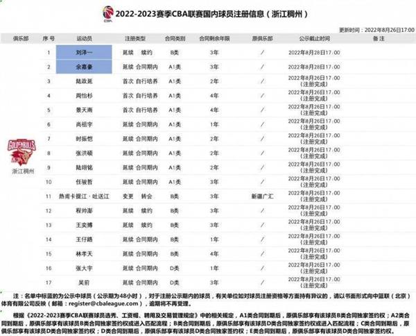 8月26日讯 今日,CBA官网更新了浙江男篮2022-23赛季的国内球员注册信息表,浙江队新增了2名国内球员完成注册。目前,浙江队已完成了17人注册。