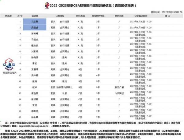 青岛男篮更新国内球员新赛季注册表:马志轩升一队签3年A1类合同