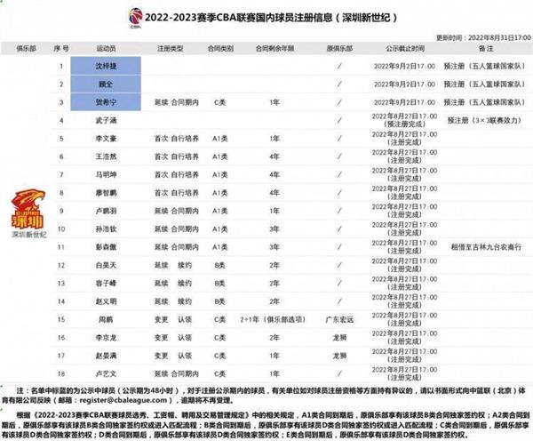 8月31日讯 今日,CBA官网更新了2022-2023赛季CBA联赛国内球员注册信息,深圳男篮为沈梓捷、顾全和贺希宁进行了预注册。深圳男篮已经完成注册18人。