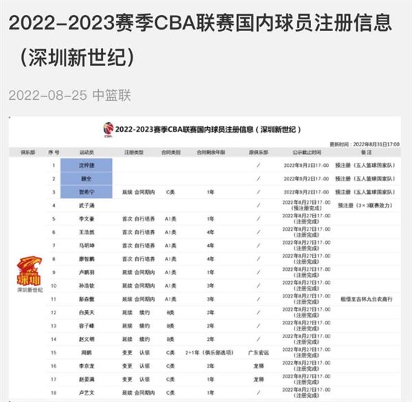 北京时间8月31日,CBA球员注册截止日,官网更新球员注册信息,深圳为沈梓捷、顾全和贺希宁预注册。