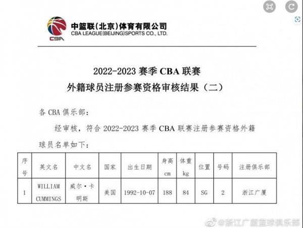 浙江官方声明如下:“目前我俱乐部已经为卡明斯完成注册,接下来卡明斯将代表浙江广厦控股队正式征战2022-2023赛季的CBA联赛。