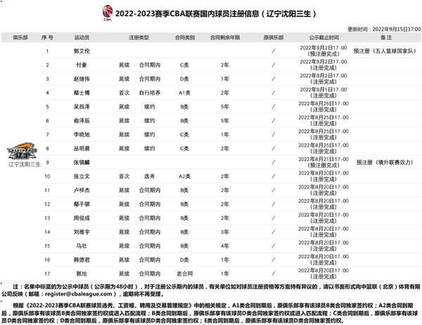 9月2日,中国男篮入境后在四川成都开始接受隔离,目前球员均已解除隔离。如果按照这个时间来推算,这批国手的CBA注册截止时间为9月18日。赵继伟与辽宁男篮的D类合同还剩下一年,付豪的C类合同还有两年,所以辽宁男篮在拿到他们的注册表格亲笔签名后就可以走注册程序了。而郭艾伦和张镇麟都处于合同到期状态,想要进行注册,球队必须先与两人续约。