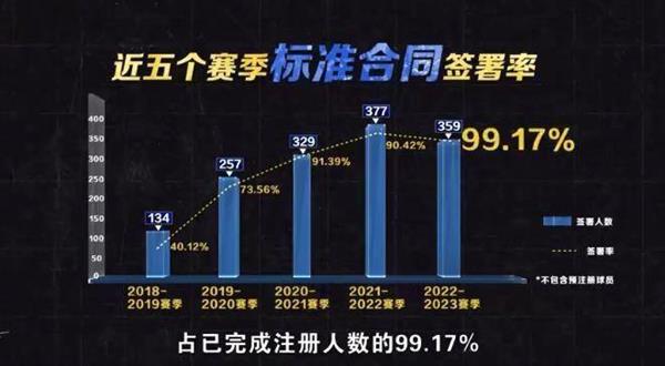 其中,CBA过去五年标准合同签署率逐步上升,2022-23赛季标准合同签署人数为359人,签署率占已完成注册人数99.17%。