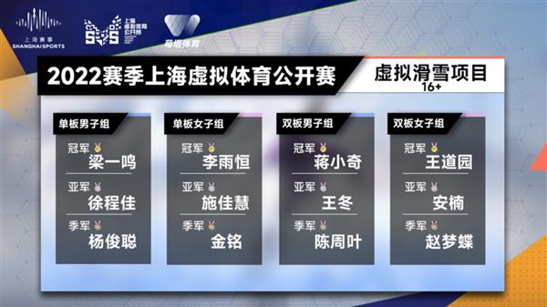 在16岁以上的虚拟滑雪项目中,梁一鸣和李雨恒获得了男女单板项目的冠军,而蒋小奇和王道园分别获得了男女双板项目的冠军。