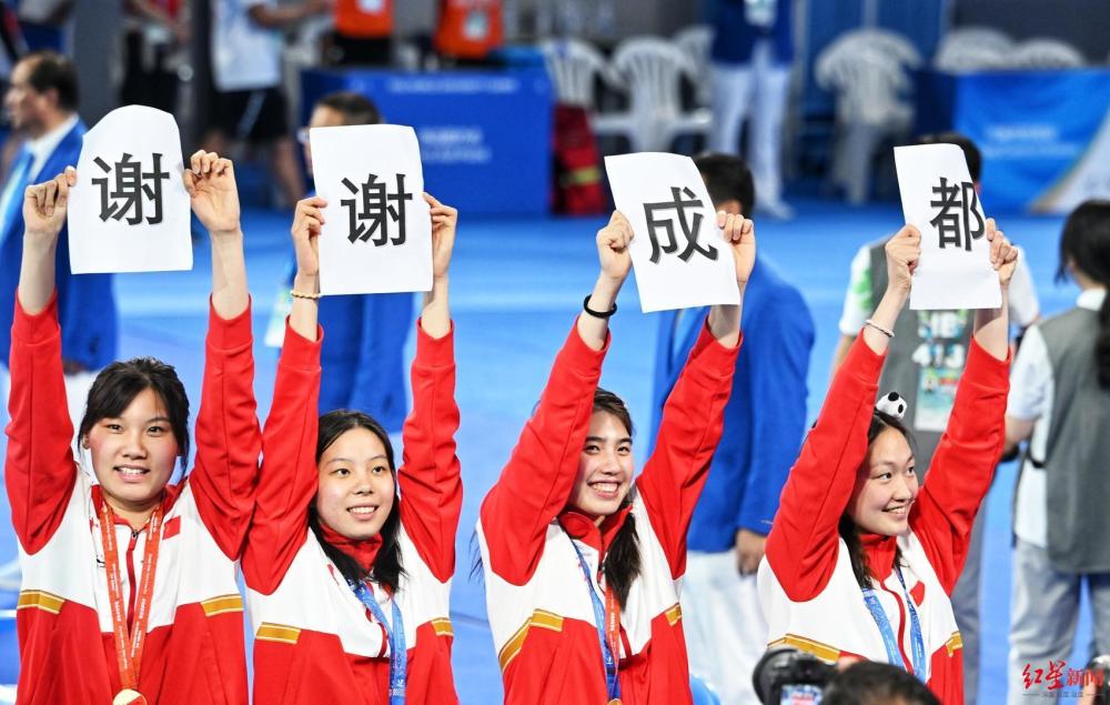 ▲获得女子4的中国队×100米混合泳冠军,标语“感谢成都”