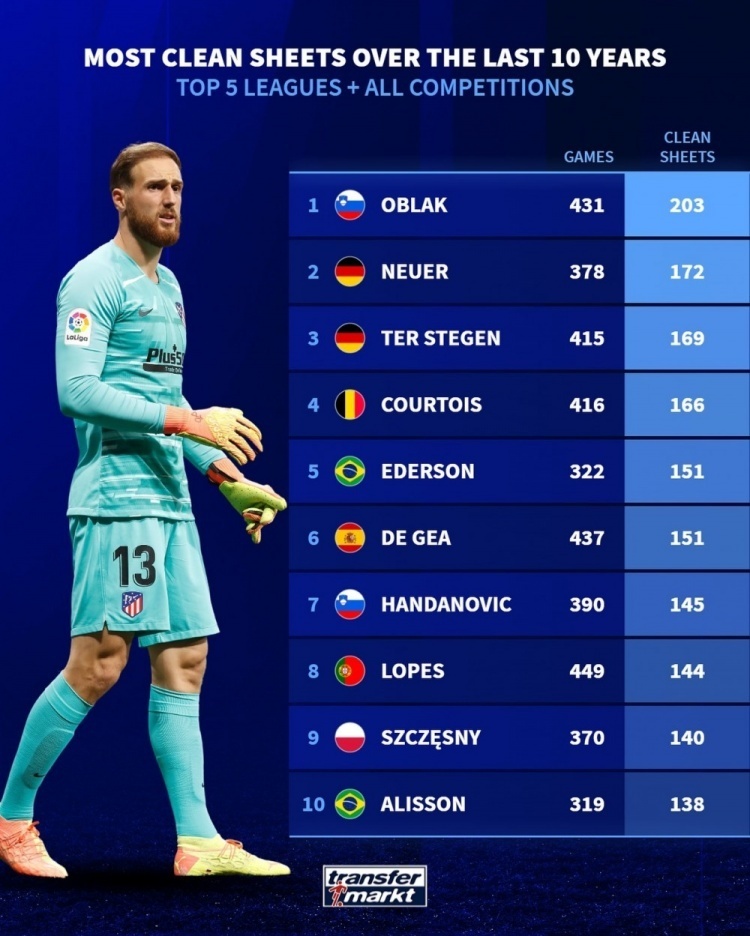 3月2日,德国转会市场统计了近10年来五大联赛门完成零封的比赛,并列出了奥布拉克以203场比赛排名第一,诺伊尔以172场比赛排名第二。