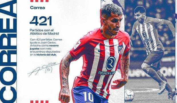 根据马竞官方的统计,安赫尔-科雷亚为马竞出场421次,与胡安-卡洛斯-阿尔特切并列历史第九。