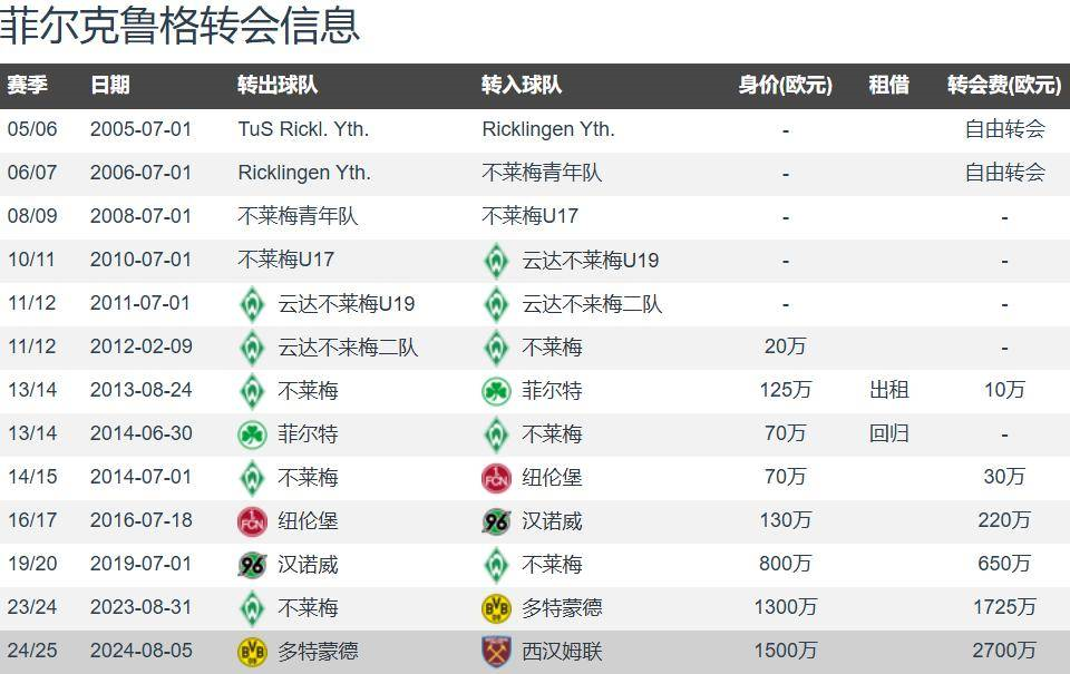菲尔克鲁格于2024年夏窗从多特蒙德以2700万欧元的转会费加盟西汉姆联,显然菲尔克鲁格完全不适应英超的比赛,身为德国国脚级中锋,至今仅为铁锤帮打入3球,这数据对于前锋而言真是惨不忍睹,目前西汉姆联在英超深陷降级区,与球队锋线不给力息息相关。