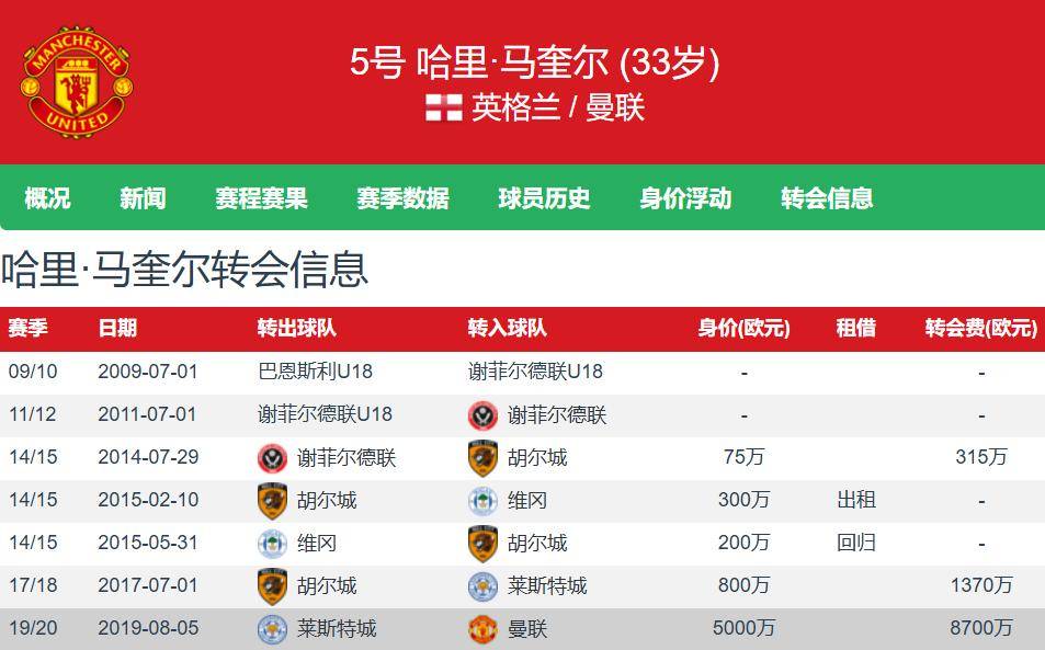 马奎尔出自谢菲尔德联青训,在莱斯特城成名,于2019年夏窗以8700万欧元的转会费加盟曼联。但在动荡的多次换帅的曼联遭遇了几次低谷,但马奎尔兢兢业业,上场就拼命,不能出场也不吵不闹,可谓是职业球员的典范。