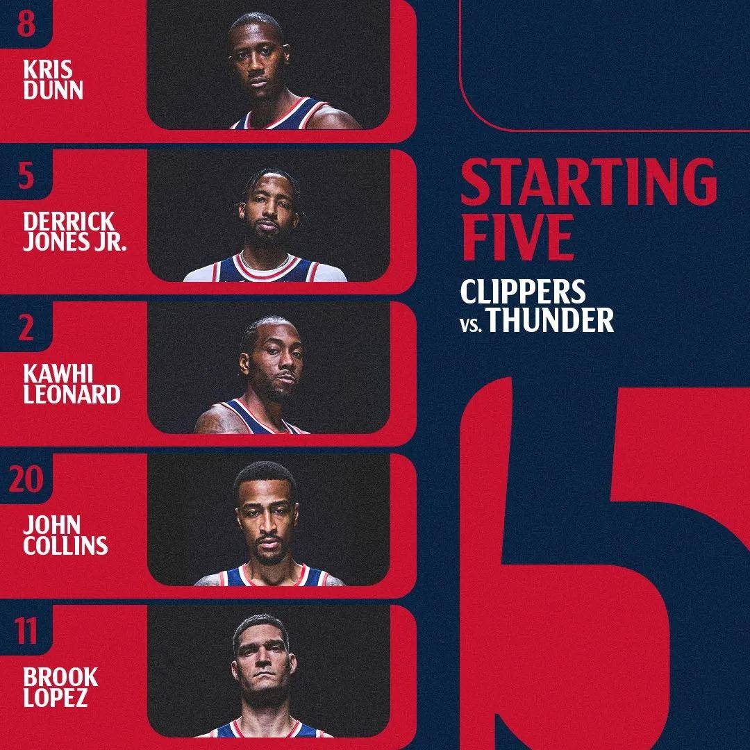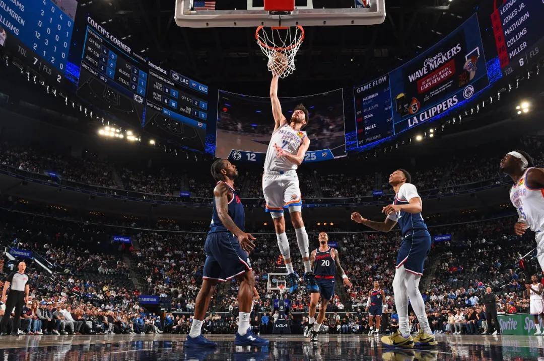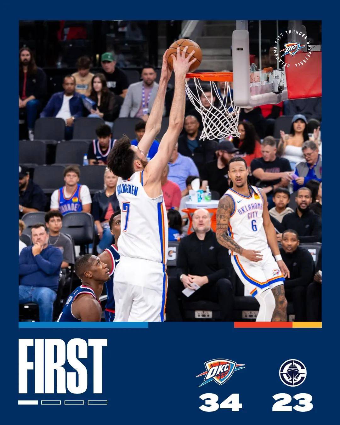快船首发:邓恩、小德里克·琼斯、伦纳德、科林斯和大洛佩兹。雷霆队首发:亚历山大、多尔特、杰伦·威廉姆斯、切特·霍姆格伦和哈尔滕施泰因。雷霆队开始充满压迫,夹住了快船队的控球员,雷霆队以19-9的比分迅速拉开到两位数。