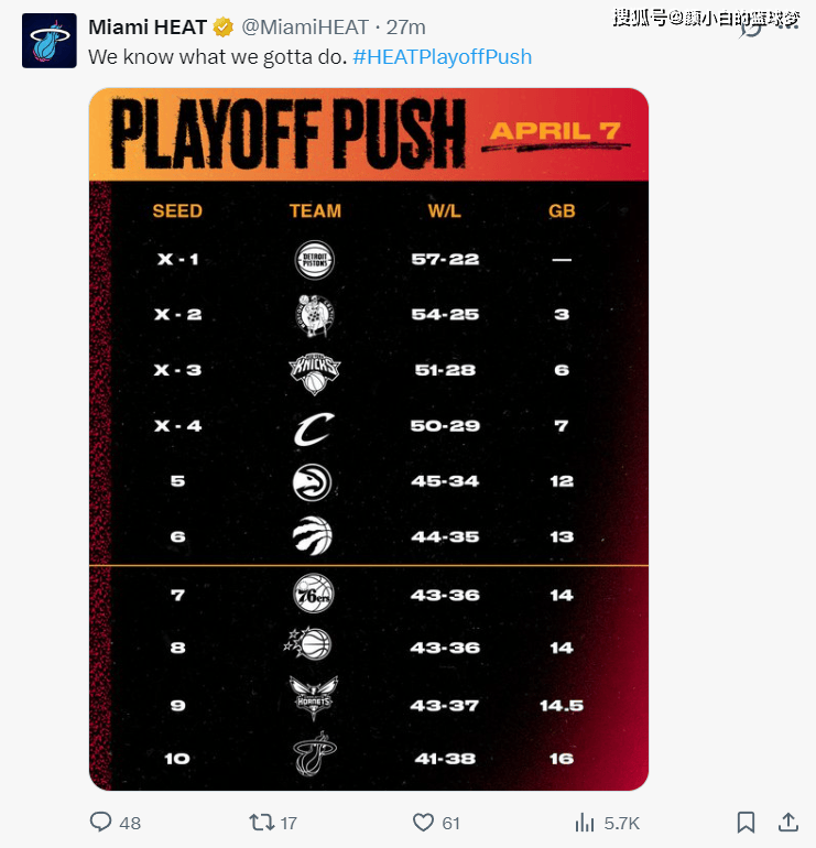 这场比赛后热火41胜38负排在东部第十,他们距离东部第九的黄蜂已经差1.5个胜场,距离东部第六的猛龙差着3个胜场。