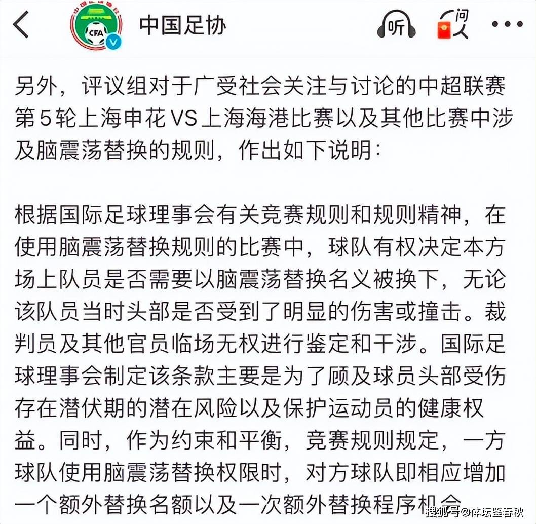 最近,中国足球协会在本赛季的第三次裁判评估中解释了杨世元在上海德比中的“脑震荡替代”。足球协会引用了国际足联的规则:将“脑震荡替代”的决定完全交给球队。换句话说,只要音乐部门认为球员有潜在的头部受伤风险,裁判就可以申请替换,裁判无权干预。这一解释也意味着没有独立的机制来验证这一判断的真实性。
