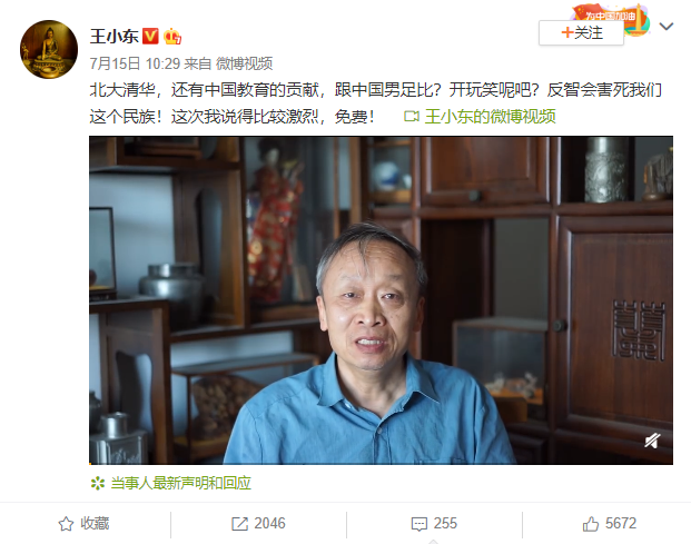 昨天,北大毕业的学者王小东在网上发布视频,对于质疑北大清华贡献,和中国教育的人进行回击,并对中国男足进行言辞犀利的批评。王小东表示: