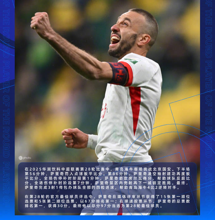 当然还是青岛海牛的萨里奇,他上演3个进球1个助攻,而且每个进球都很精彩,这是他的个人秀,把北京国安后防彻底击破,他不仅有进球,更有助攻,在本轮他以绝对优势胜出,媒体评审环节给出15张第一顺位选票,球迷投票环节总票数第一,最终以97分碾压式当选第28轮最佳球员,这不是运气,而是实力与心态的双重爆发,他未来能否留在青岛海牛?